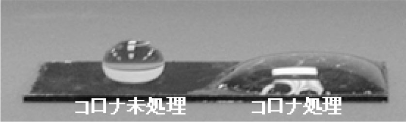 コロナ処理を行なうことによって、液体の密着性が上がっているのがわかります。